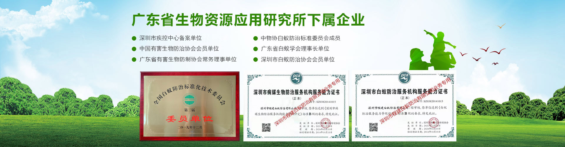 深圳市程建白蟻防治中心有限公司(深圳市白蟻防治中心、深圳市殺白蟻公司、滅白蟻公司、治白蟻公司、除白蟻公司、防白蟻公司、深圳市消殺公司、深圳市殺蟲公司)、于二00二年十一月成立。是經(jīng)深圳市政府有關(guān)部門批準(zhǔn),市工商行政管理局注冊登記的法人企業(yè),深圳市蟲鼠防治協(xié)會(huì)(PCO)成員單位,持有政府部門頒發(fā)“白蟻防治服務(wù)機(jī)構(gòu)服務(wù)能力證書B級(jí)”、“有害生物防制服務(wù)機(jī)構(gòu)服務(wù)能力證書B級(jí)”雙資質(zhì)證書的有害生物防治單位。公司主要服務(wù)政府、事業(yè)、企業(yè)、工廠、賓館、園林、小區(qū)、大廈等單位的白蟻防治、有害生物防制施工的專業(yè)機(jī)構(gòu)。技術(shù)力量雄厚,擁有各層次專業(yè)技術(shù)人員三十多名。